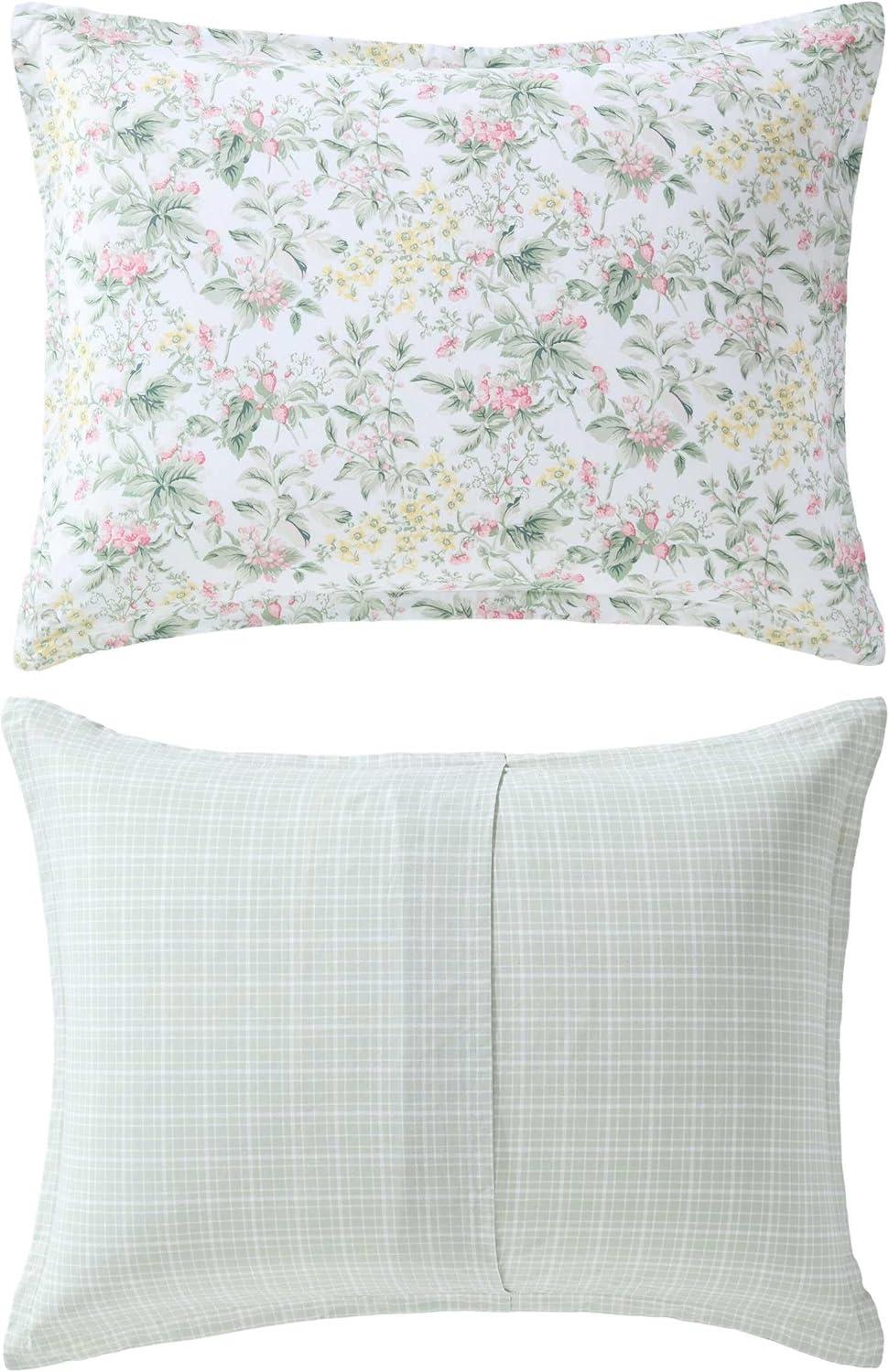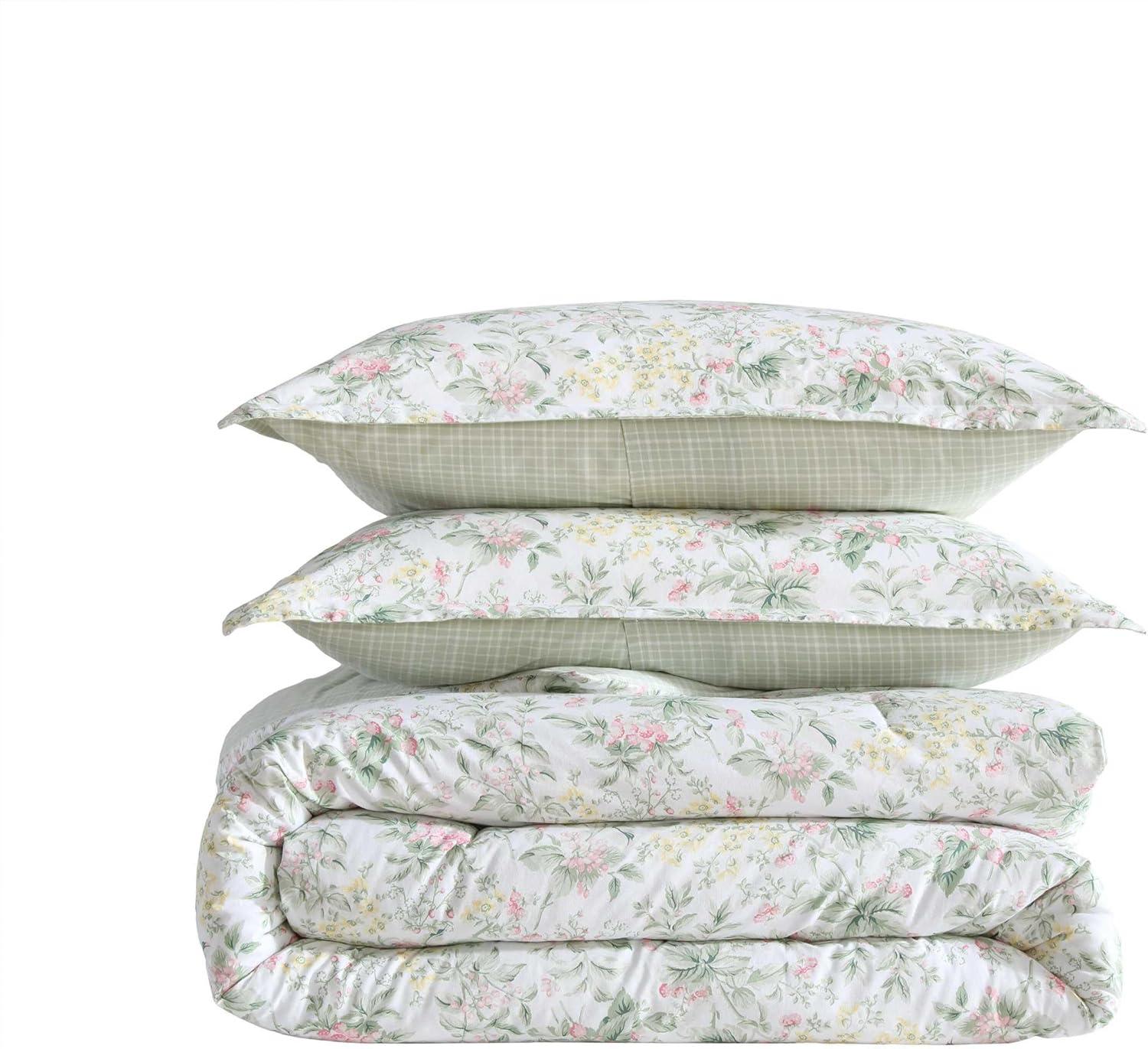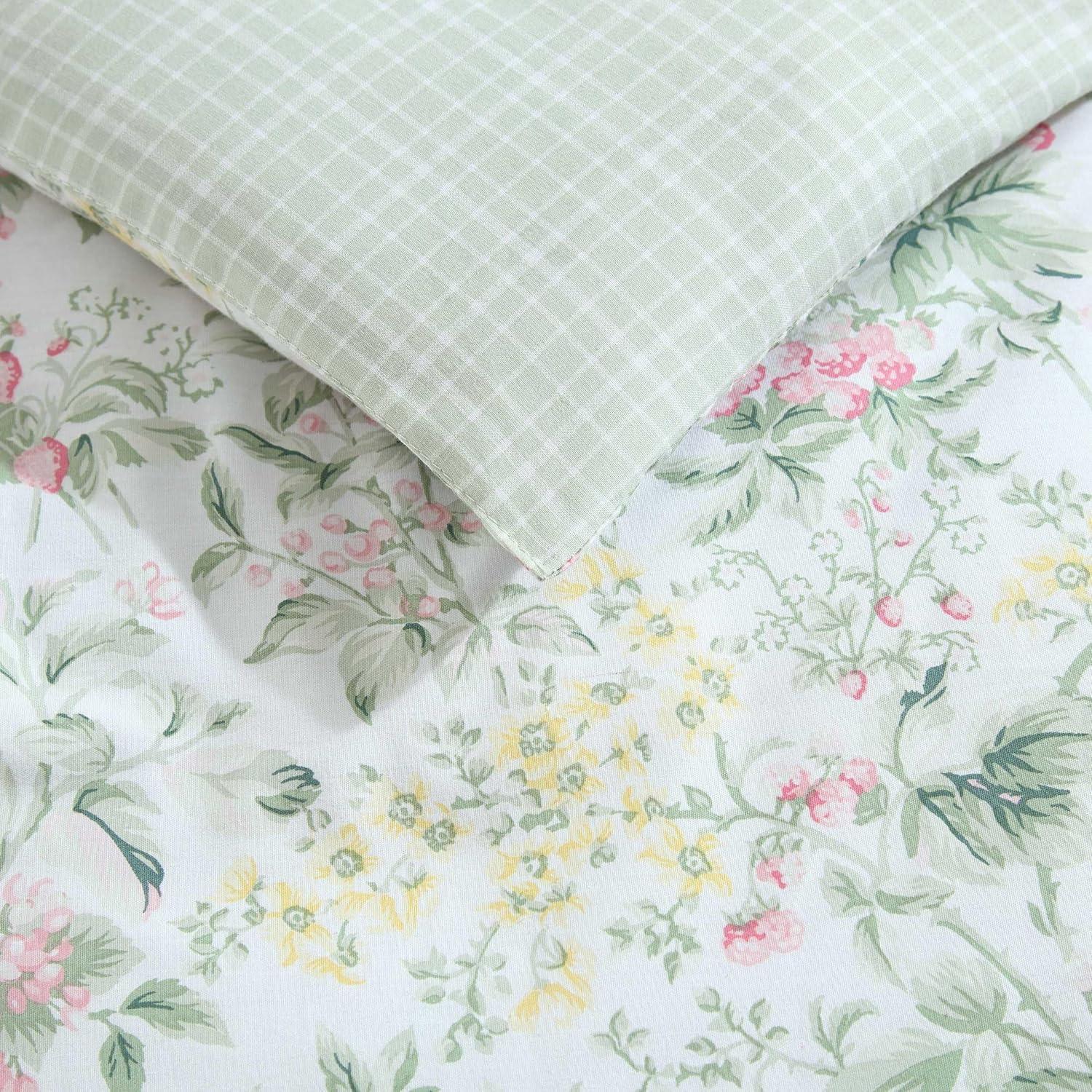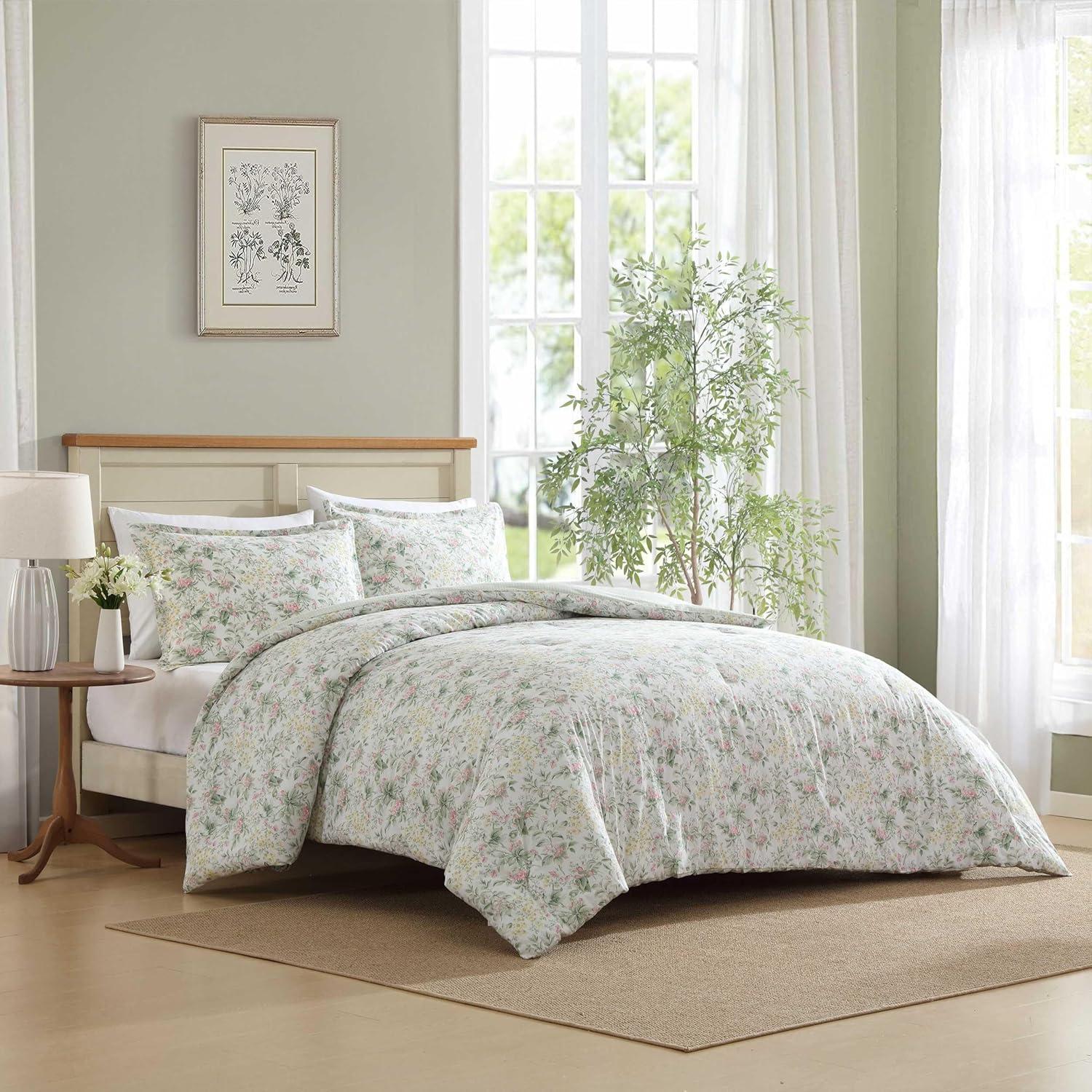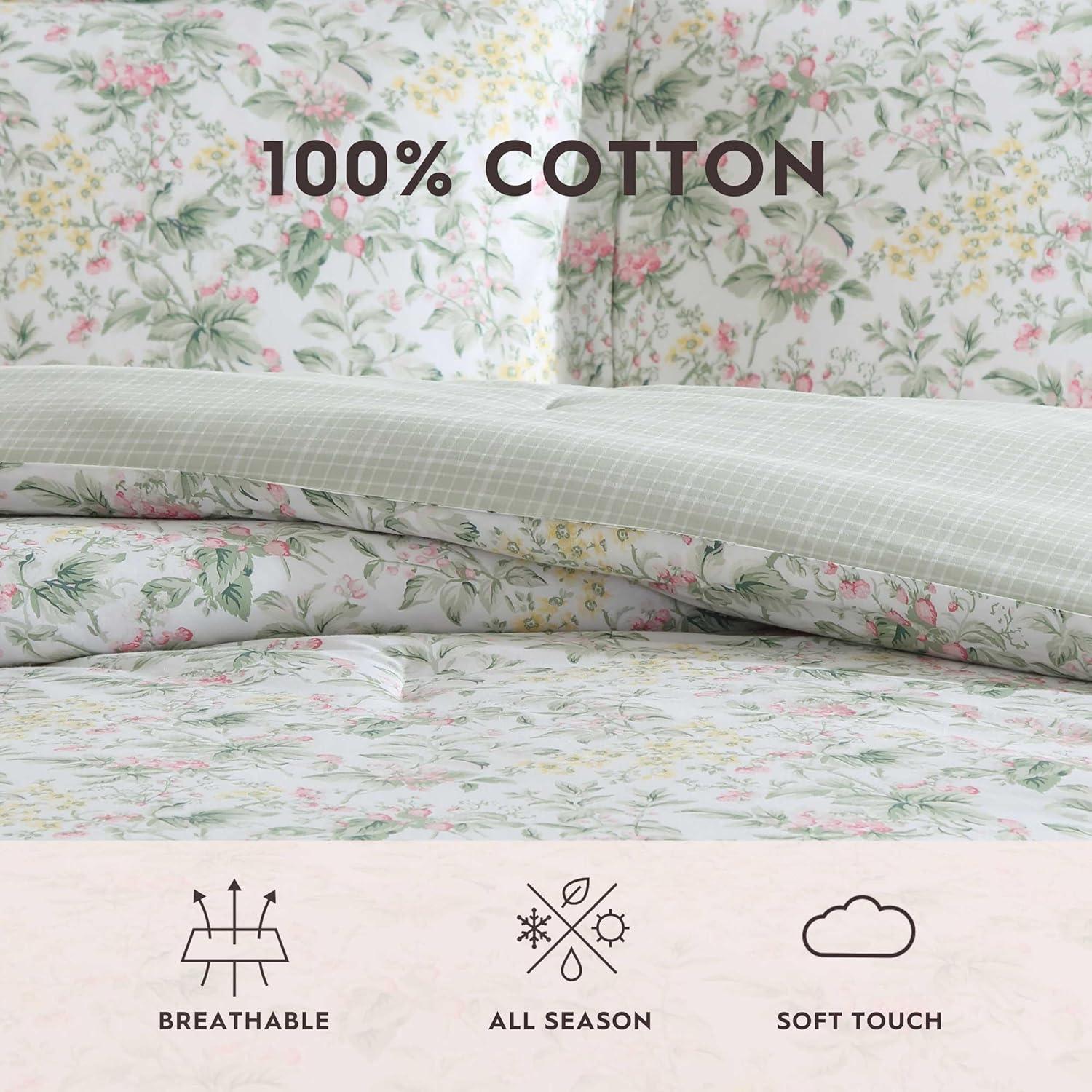 The Laura Ashley Heather Garden Comforter Set features a romantic floral design with soft pastel hues that adds a timeless touch to your space. This set blends classic charm with a modern edge, bringing sophistication to any bedroom. The comforter is crafted with a 100% cotton for a smooth, breathable feel, ensuring gentle comfort for every season. Filled with lightweight polyester, this set provides cozy warmth for a restful sleep. Available in twin, full/queen, and king sizes, the set includes one comforter and two shams (one sham for twin size). Set is machine washable for easy care- suitable for extra-large capacity washers.