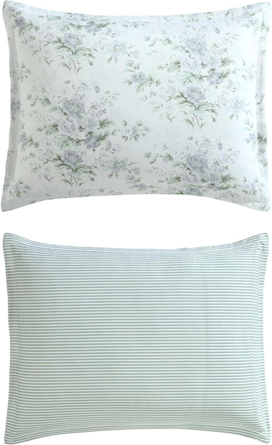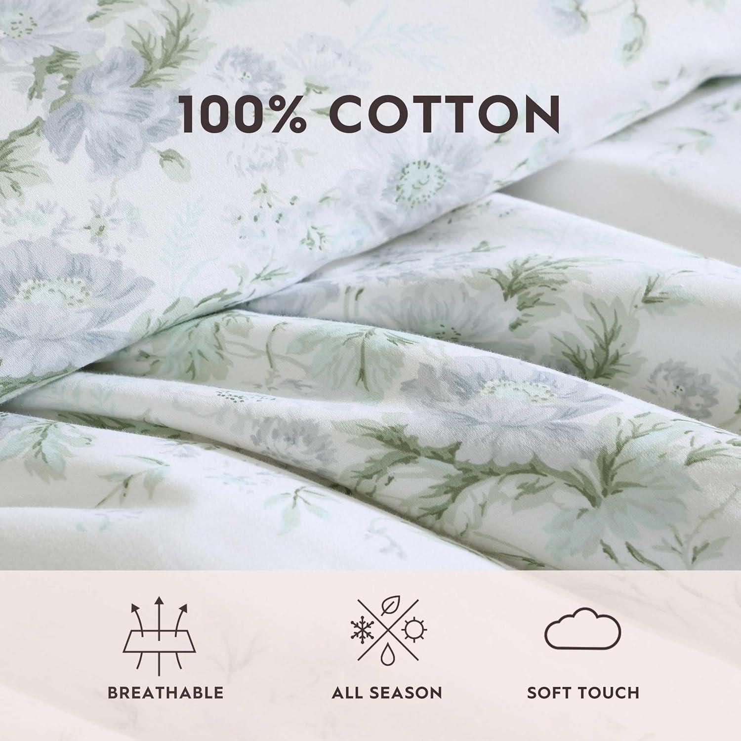 The Laura Ashley Arundel Duvet Cover Set is inspired by a touch of serene romance with a watercolor-like quality. We gathered traditional floral clusters in grey tones and green leafy stems and printed on a delicate white background, creating a feminine aesthetic. Made from 100% cotton, this lightweight duvet cover set is easy to layer. Set is standard 100 by oeko-tex certified and machine washable for easy care. The set is available in twin, full/queen, and king sizes, including one duvet and two shams (one sham for the twin size). Machine washable for effortless care, this set offers style and convenience, perfect for adding a serene, elegant touch to your bedroom.