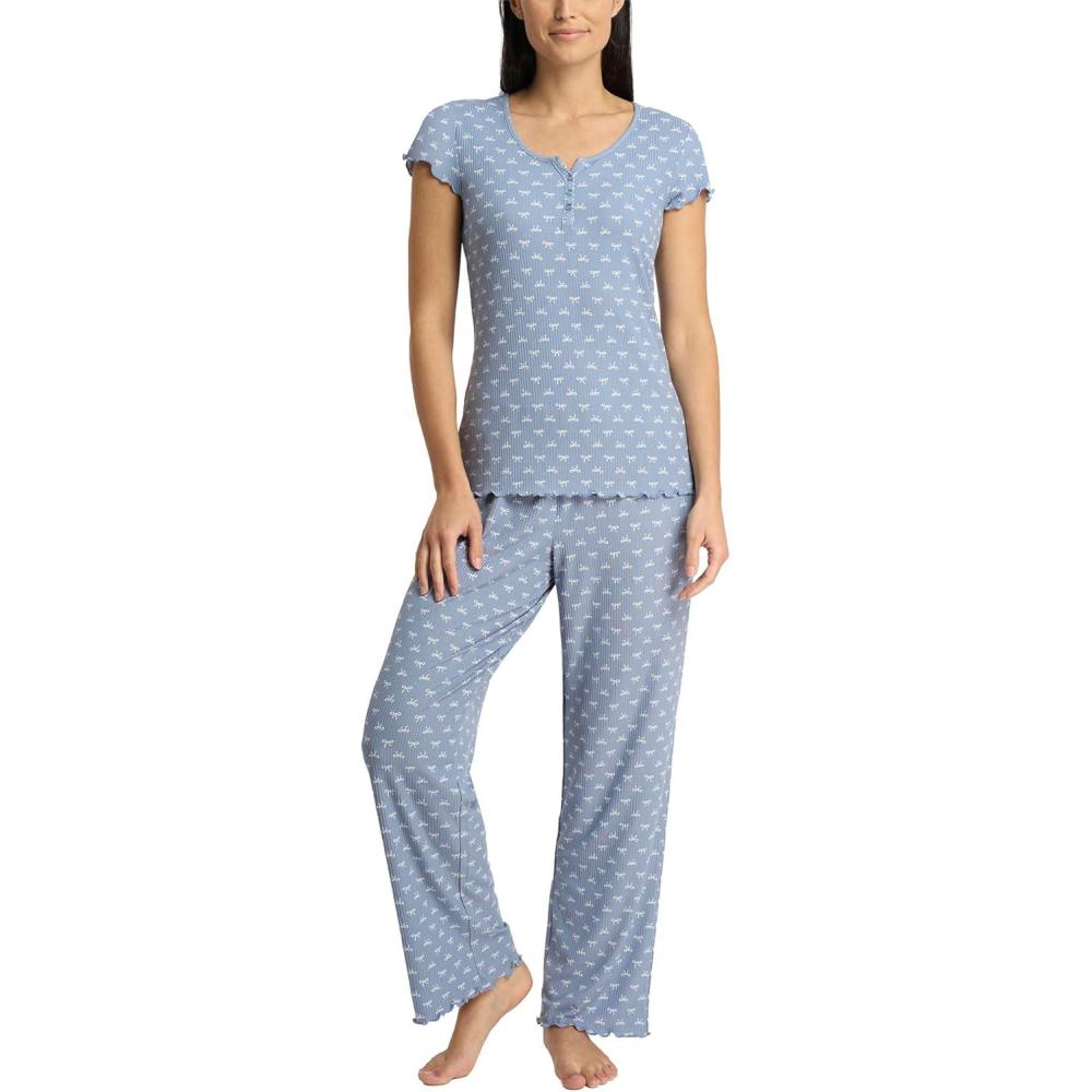 Laura Ashley Women’s Pajamas 2 Piece Ribbed Knit Short Sleeve Henley Top and Pants PJ Set(Blue Bows)