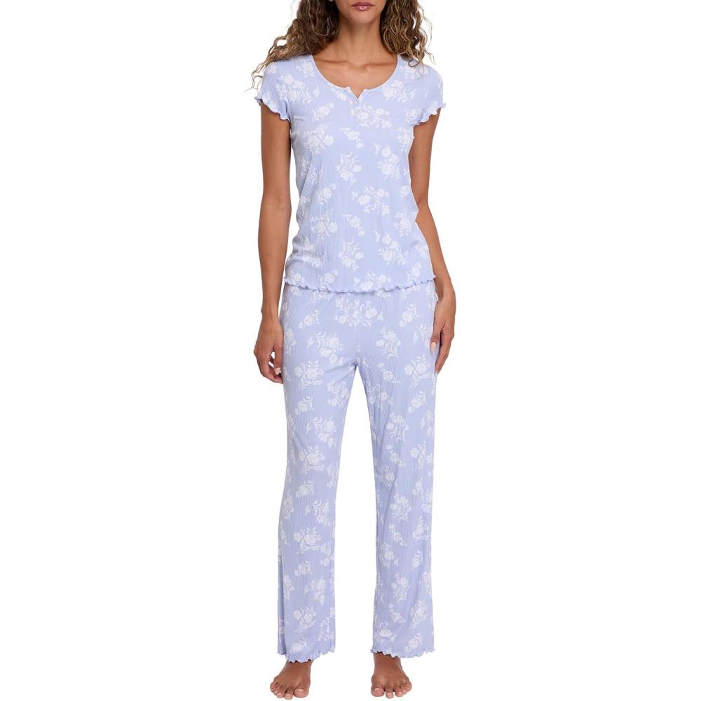 Laura Ashley Women’s Pajamas 2 Piece Ribbed Knit Short Sleeve Henley Top and Pants PJ Set(Chambray Floral)